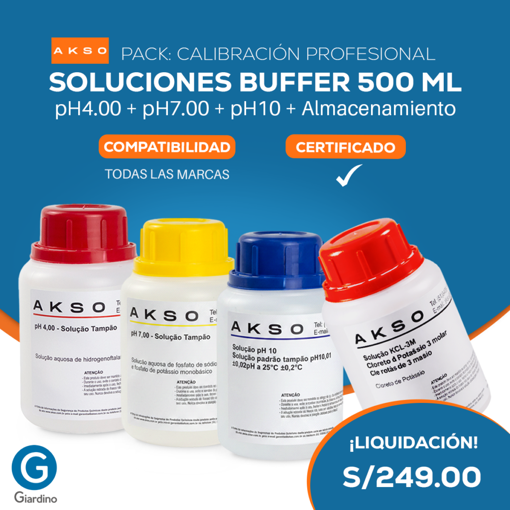PACK CALIBRACIÓN PROFESIONAL – SOLUCIONES BUFFER 500ml PH4.00 + PH7.00 + PH10 + ALMACENAMIENTO – AKSO