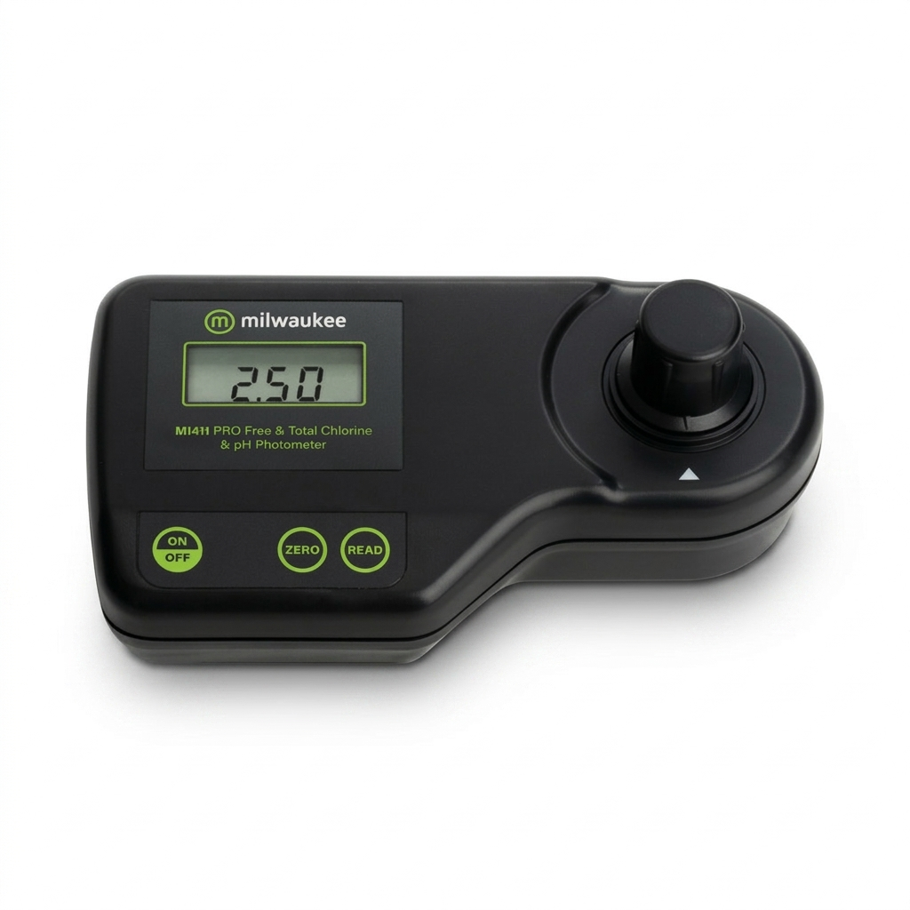 FOTÓMETRO COMBINADO PROFESIONAL (MILWAUKEE) El MI411PRO es una herramienta de alta gama diseñada para ofrecer la máxima precisión en el monitoreo de desinfectantes y el equilibrio químico del agua. A diferencia de los comparadores de color manuales, donde la interpretación visual puede llevar a errores, este fotómetro digital elimina las conjeturas, proporcionando lecturas exactas gracias a su tecnología de medición óptica avanzada. Es el equipo ideal para operadores de piscinas públicas, técnicos de agua municipal y profesionales de la industria que necesitan reportar datos técnicos con rigor. Su diseño robusto está preparado para las exigencias del trabajo de campo, asegurando que la gestión del cloro y el pH sea siempre óptima.